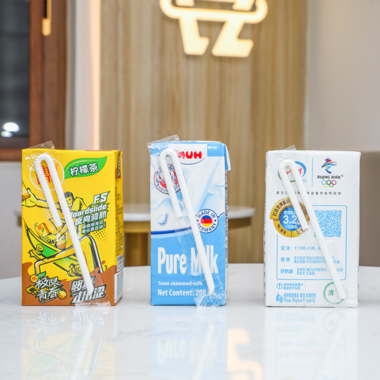U-shaped bendy straws with plastic flow wrapped, a revolutionized bendable paper straws produced by RainbowBear, are specifically designed for boxed drinks. They are individually wrapped in a continuous plastic film wrapper, which can be attached to the box automatically. With a diameter of 4-6mm and length from 150-180mm, they can fit different liquid box packaging.
